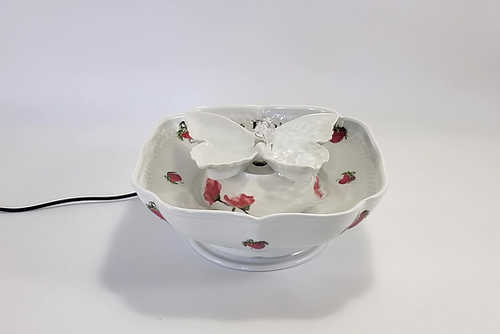 This charming ceramic cat fountain features French "Les Fraises" for "The Strawberries"